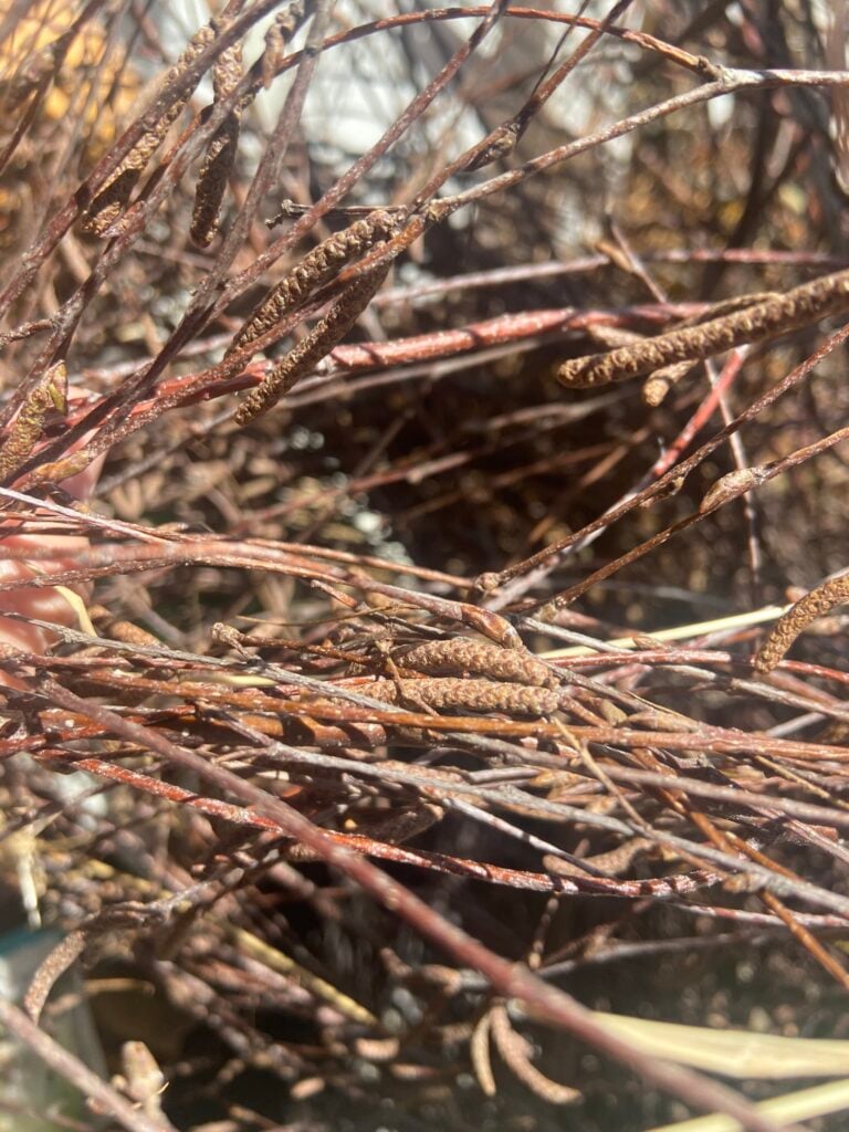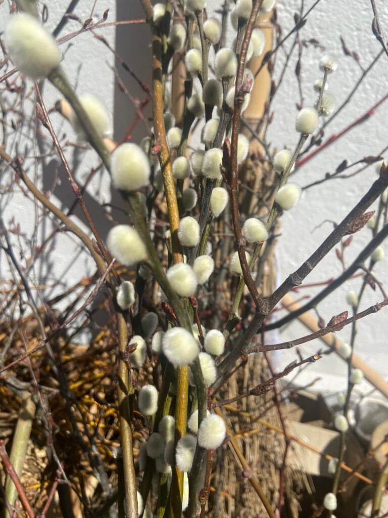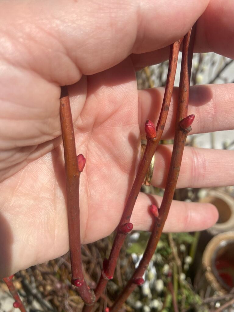 The next layer is to provide colour and textural accents in contrast to the birch twigs. I love willow catkins for their cute fluffy buttons. They are often available for sale in garden centres and florists, and you only need one or two stems for each wreath. Dogwood stems can also provide a bright pop of colour that stand out well against the brown of the birch. Cut sections with secateurs and tuck them into the birch stems, securing the ends discreetly with brown wire or floral tape.
