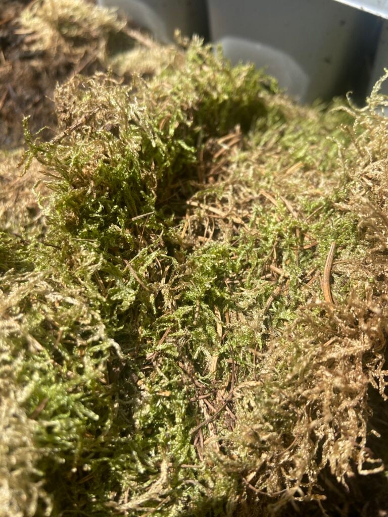 The last layer is the most fun, creating kokedama, or moss balls, with live bulbs. A “real” kokedama is intended to live for a long time inside the moss cocoon, but these are intended to survive until the flowers are finished, then you can unwrap them, plant the bulbs outside or switch them for different spring flowering bulbs. The bulbs can be bought from any garden centre, planted up and ready to flower. Pick a bulb with a healthy stem and a flower bud, and take it out of the pot. Brush off some of the soil from around the roots and then wrap the bulb and roots in moss.