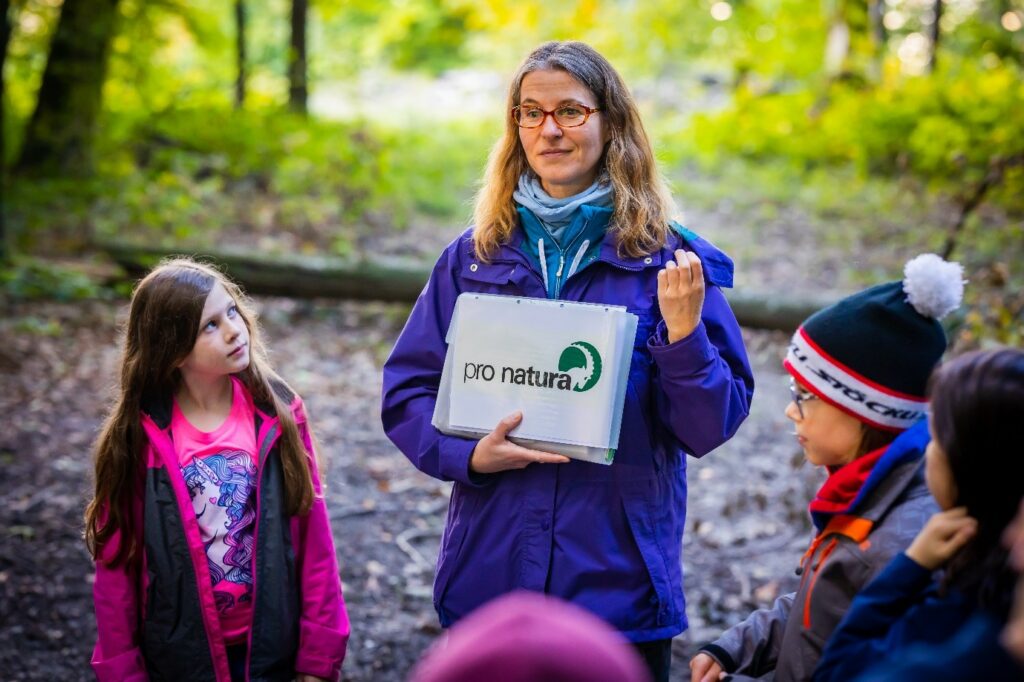 The students gather in a circle in the heart of the forest to listen to Cindy, the Pro Natura representative, explain the lesson learning goals – to learn about the wild animals of Switzerland, and to communicate and cooperate with one another in different team activities as they do so (in French, of course!).