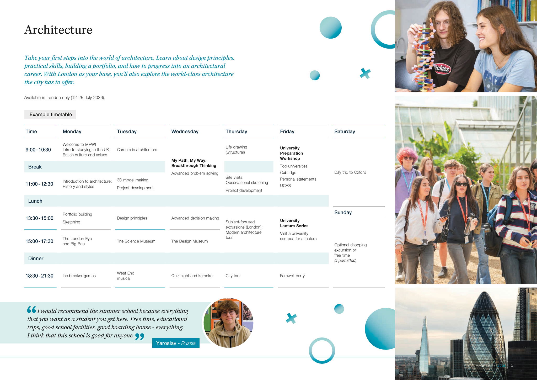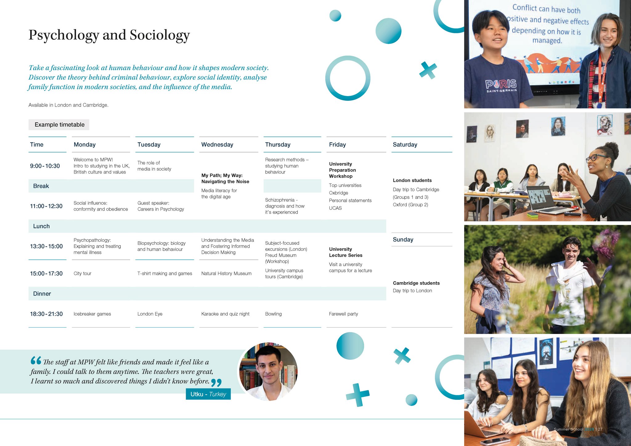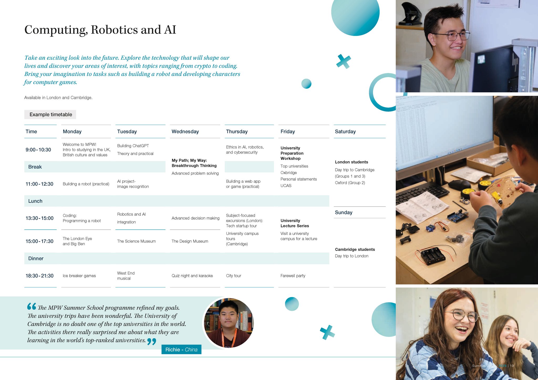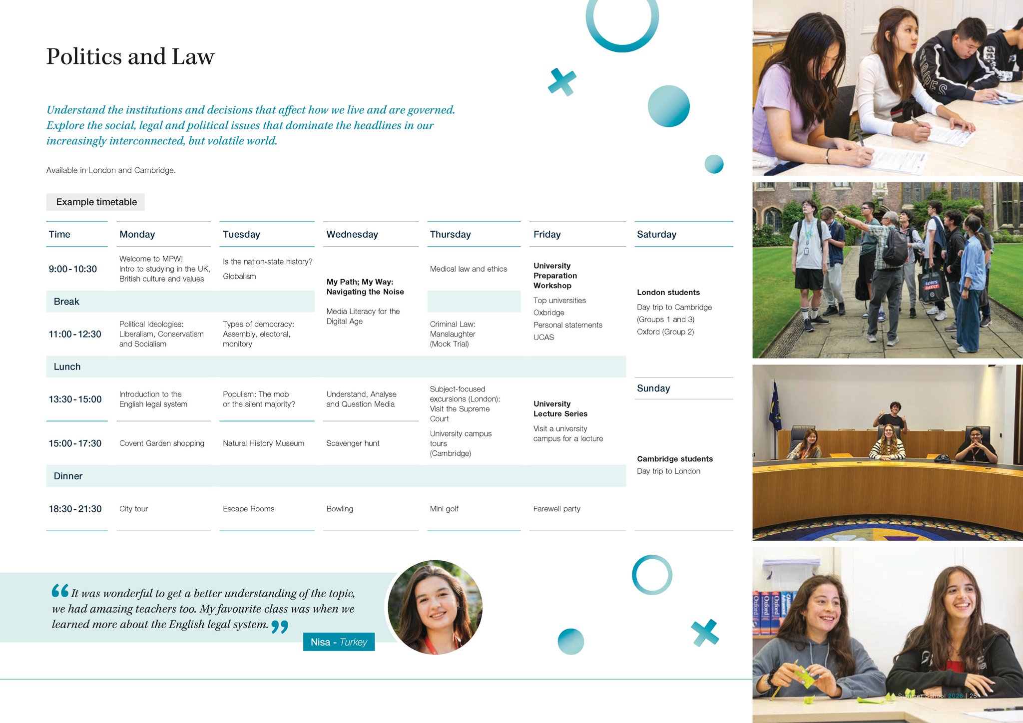Our expertly-designed programmes allow you to explore future careers and traditional academic subjects in refreshing new ways, as well as equipping you with essential skills for life, like public speaking and advanced problem solving. As an international Summer School (we hosted students from 36 countries in 2025), our unique mix of UK and international students provides you with the perfect environment to practice and develop your English language skills, learn about different cultures and make new friends. Based in London and Cambridge, our campuses are perfectly located for you to take advantage of a packed schedule of social and cultural activities, making the most of your time outside of the classroom. Plus you can look forward to lectures and career talks delivered by world renowned and leading university academics in their respective fields. A summer with MPW is unique, unforgettable and transformative.