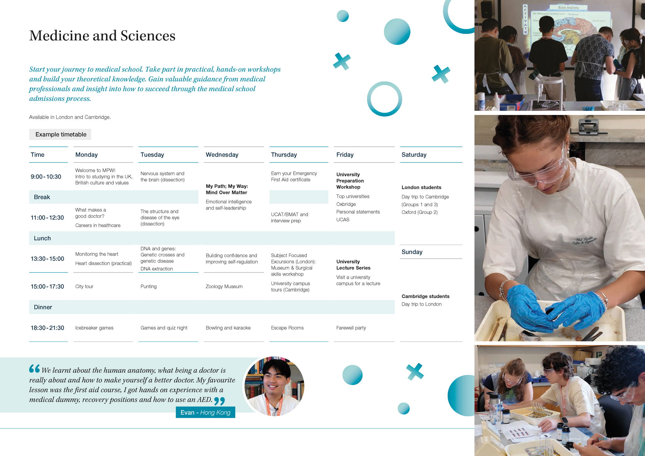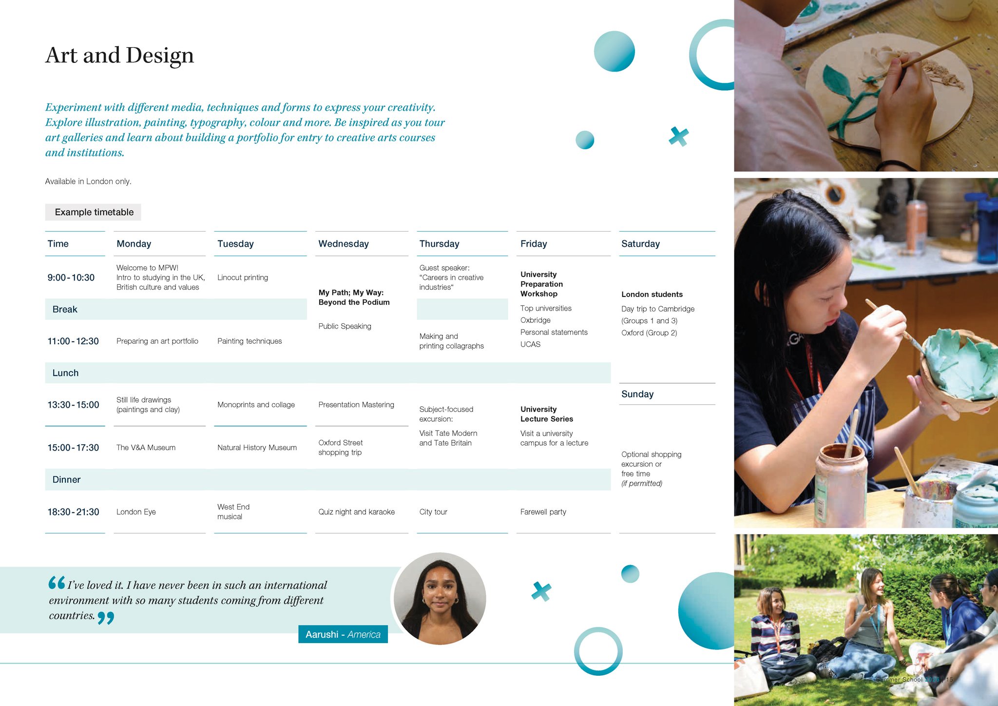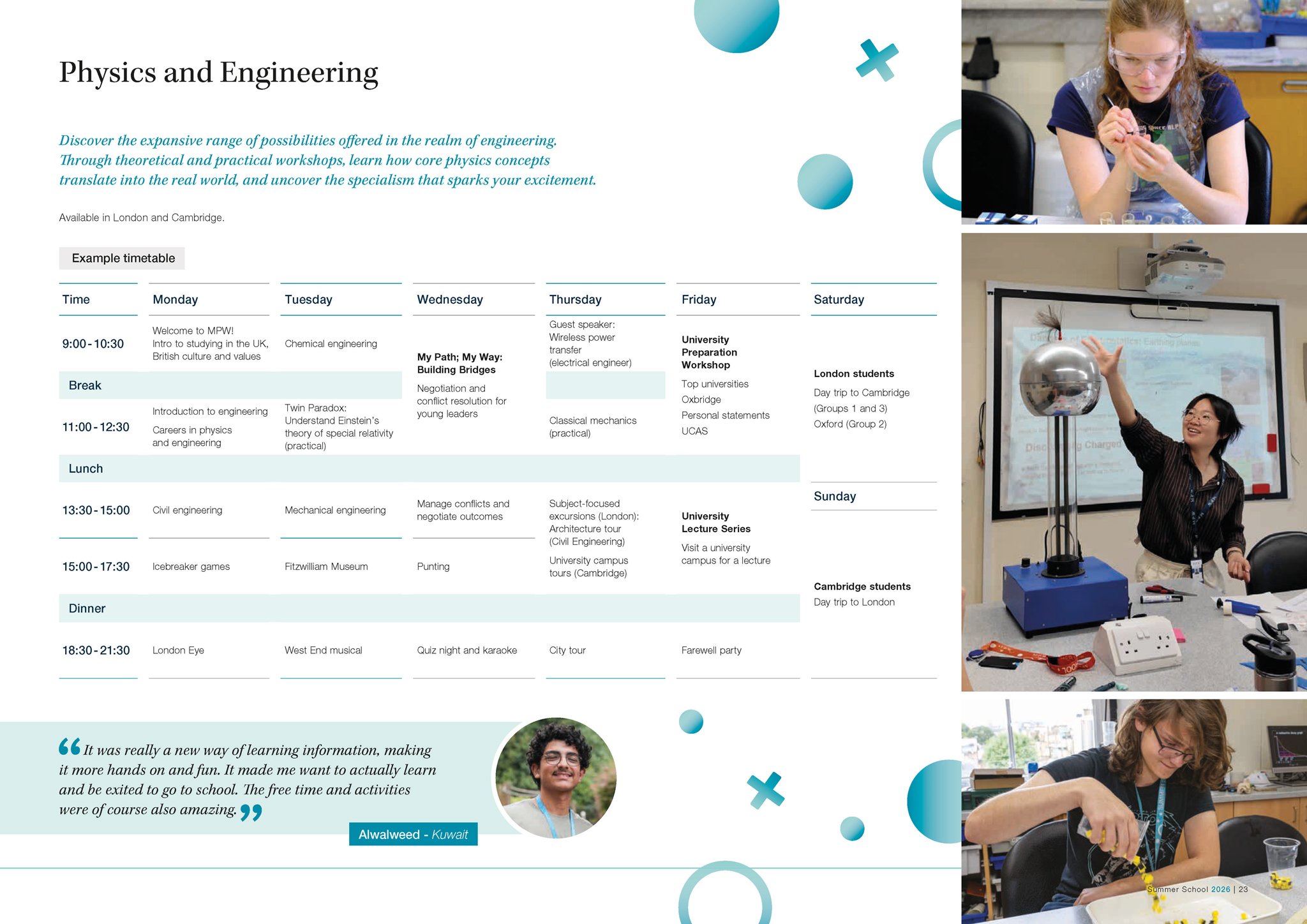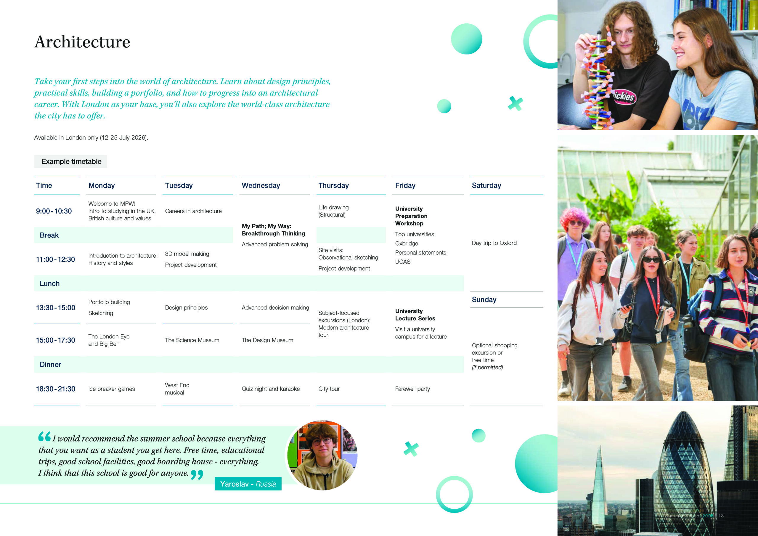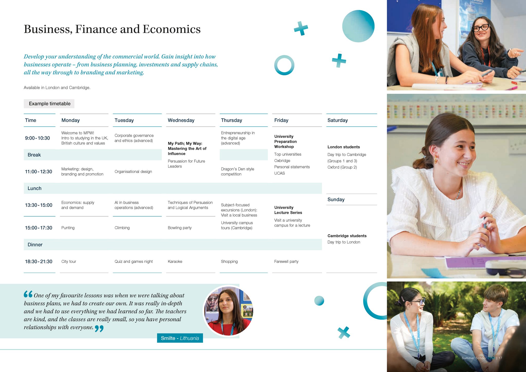 Our expertly-designed programmes allow you to explore future careers and traditional academic subjects in refreshing new ways, as well as equipping you with essential skills for life, like public speaking and advanced problem solving. As an international Summer School (we hosted students from 36 countries in 2025), our unique mix of UK and international students provides you with the perfect environment to practice and develop your English language skills, learn about different cultures and make new friends. Based in London and Cambridge, our campuses are perfectly located for you to take advantage of a packed schedule of social and cultural activities, making the most of your time outside of the classroom. Plus you can look forward to lectures and career talks delivered by world renowned and leading university academics in their respective fields. A summer with MPW is unique, unforgettable and transformative.